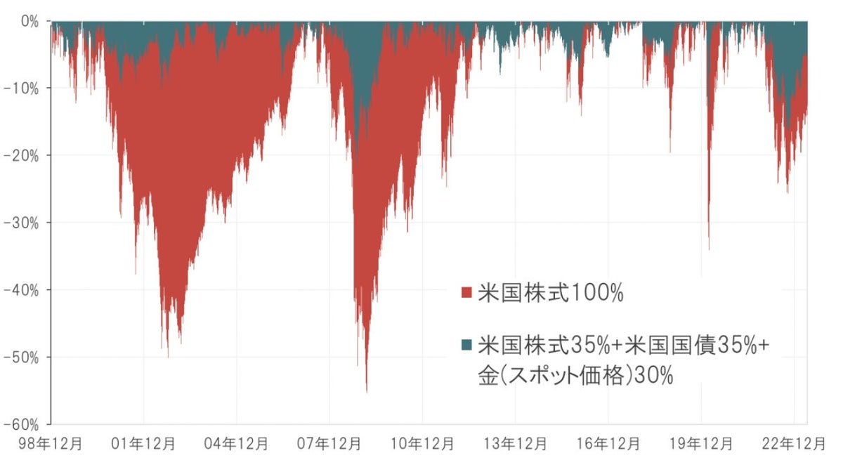図表2: 米国株式と米国国債、金 スポット価格 を組合わせたポートフォリオのドローダウンの推移