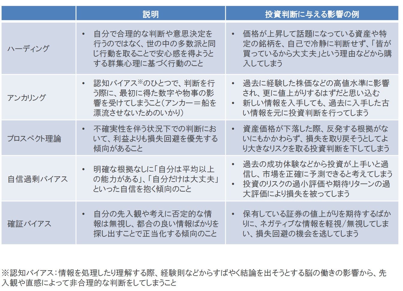 図表1に行動ファイナンスにおける代表的な行動を示しています。その中でも「プロスペクト理論」による投資行動の説明では、投資家は収益よりも損失の方に敏感に反応するとされています。収益が出ている場合はすぐに利益確定に走りやすい一方、損失が出ている場合には、それを取り戻そうとよりリスクを取るような投資判断を行いやすくなります。また、上昇相場において、乗り遅れたくないという焦りの気持ちから冷静な分析をせずに相次いで投資に参加するような行動を「ハーディング」と呼びます。群集心理に基づく行動のことで、相場の急落局面において、恐怖に駆られてパニック状態になり、同様に冷静な分析なしに投げ売りが相次ぐ現象もこれに該当します。このような合理性を欠いた投資行動の背景には、人間の脳に本来備わっている作用が大きな要因と考えられていますが、このような作用を完全に排除することは困難であると思われます。そのため、長期の資産運用を行う場合には、相場の変動に惑わされることがないような仕組みを構築しておくことが有効といえるでしょう。感情を挟まず、一定金額を機械的に買い付ける積立投資が代表的ですが、その投資対象を分散させることで、更に効果を高めることが期待されます。分散投資による資産運用は、預金ではなく投資である以上、リターンがマイナスになることもありますが、リスクを抑制しながら安定したリターンの獲得を目指す手法は、長期投資に適したものであるといえます。このように投資家が陥りやすい思考や非合理な投資行動を完全に防ぐことはできなくても、その具体例を学び、感情に左右されにくい投資の仕組みをつくっておくことで長期の資産運用を実現できると考えられます。