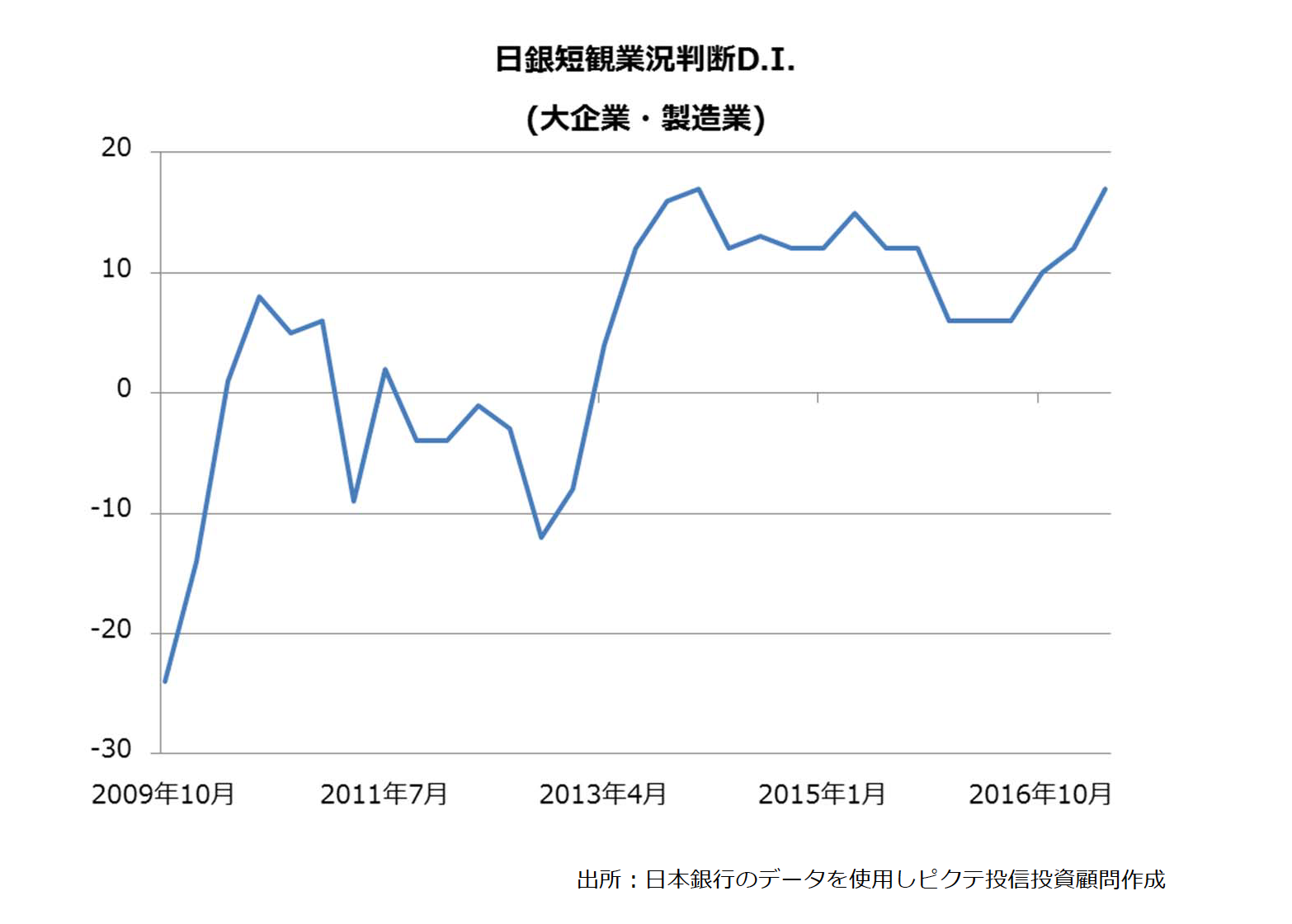 ⽇銀短観は、抽出された⽇本企業1万社が現在および将来の景気や業績⾒通しについて回答しているため、⽇本経済の現状を把握することが可能となります。その中でも代表的なものが、製造業のなかの⼤企業の業況判断D.I.です。景況感が良いと回答した企業の⽐率から、悪いと答えた企業の割合を差し引いています。下のグラフが、2017年7月時における業況判断D.I.の推移を示しています。直近2017年7月の数字は、3期連続で上昇して17%ポイントとなっています。前回より5ポイント上昇していて、この上昇幅は2013年9月以来の⼤きさとなりました。製造業のうち13業種が業況が上向いていると回答し、⽇本の景気の底堅さが伺えます。