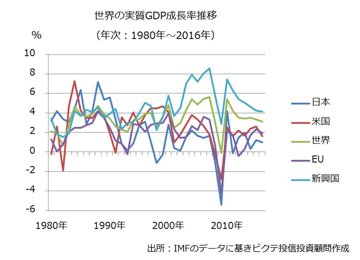 ・世界全体および主要な地域のGDP成⻑率の推移を表したのが以下のグラフです。1980年代から1990年頃にかけて、⽇本はバブル景気のため相対的に⾼い成⻑率でしたが、最近は低成⻑となっています。2000年以降では、新興国の成⻑率が際⽴っています。2008年のリーマンショックで先進国が軒並みマイナス成⻑に陥ったときにも、新興国はプラスの成⻑を維持しました。