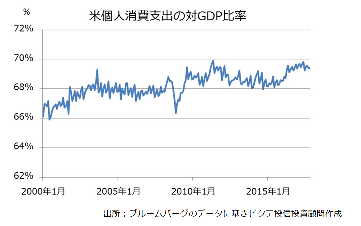 この指標の重要性は、個人消費が米国のGDPの約7割を占めている(下記グラフご参照)ことから、小売売上高の動向が米国景気に⼤きく影響するということです。例えば、例年1⽉に発表される数値には、前年のクリスマス商戦の結果が反映され、最も消費が旺盛な時期の米国の消費者マインドを色濃く反映しています。同様に、10⽉に発表される数値には、米国の学校の新学期である9⽉の情勢が反映されています。