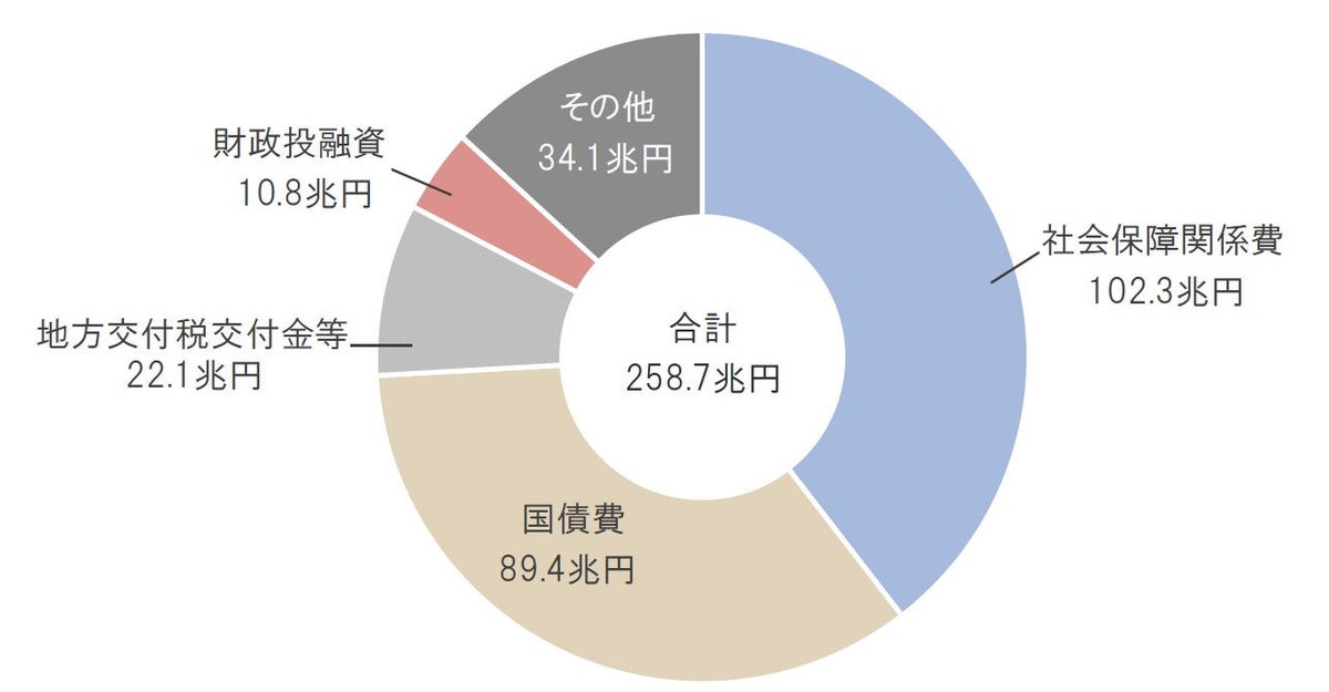 前回、日本の政府債務残高(対GDP比)が諸外国に比べ、突出して高い状況にあることをご説明いたしましたが、その原因の1つとして、基礎的財政収支(プライマリーバランス)の赤字が指摘されています。プライマリーバランスとは社会保障や公共事業をはじめ様々な行政サービスを提供するための経費(政策的経費)を税収等で賄えているかどうかを示す指標ですが、少子高齢化の進展等に伴う社会保障関係費の増加が、税収等の伸びを上回っている状況が続いています。このプライマリーバランスの赤字を特例公債注1等の継続的な発行によって賄ってきたため、現在の巨額な債務残高につながったといえます。令和6年度予算をみてみると、一般会計と特別会計の主要経費別純計注2258.7兆円の内、社会保障関係費が102.3兆円、国債費が89.4兆円となっており、この2つの合計で全体の70%を超えています(図表1)。また、増え続ける借金は、当然、今後の利払い費の負担増加にもつながります。