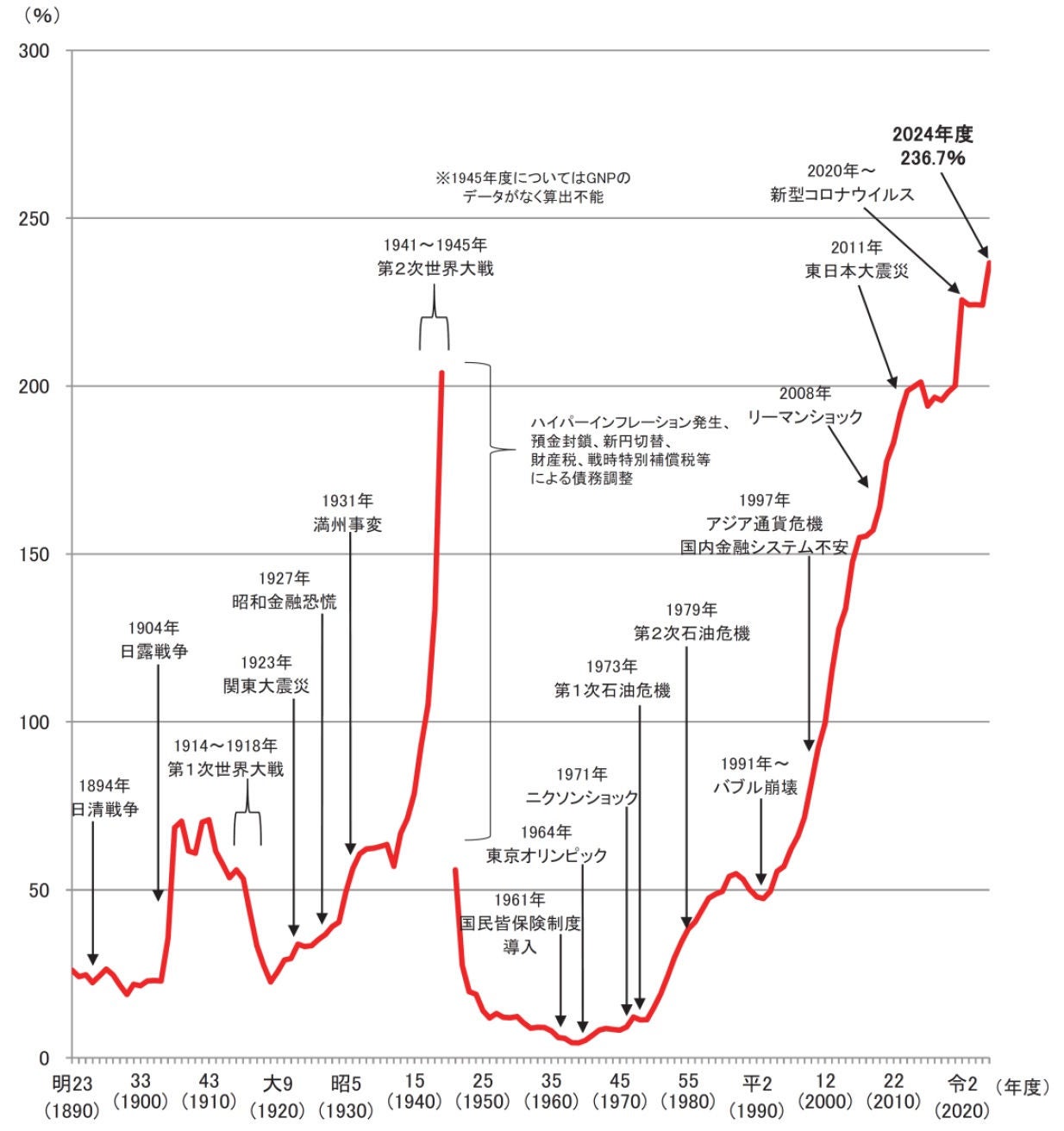 図表2:日本の政府債務残高GDP比の推移 (期間:1890年~2024年)