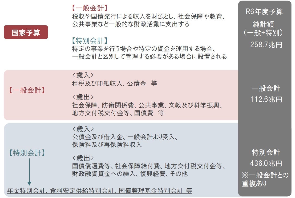 日本の国家予算には一般会計と特別会計があり、財政状況はこの2つを合算して確認する必要があります。会計が分かれている理由は、予算管理が複雑化することを防ぐためであり、この2つの純計額注を確認することで、国家予算の全体像を把握することができます。また、2つの違いとしては、一般会計が社会保障、地方交付税交付金、教育、公共事業、防衛など国の基本的な政策の経費を賄う会計であるのに対し、特別会計は上記以外の特定の事業を行う場合や特定の資金を運用する場合、一般会計とは区別して管理する必要がある場合に設置されるものとなっています(図表1参照)。