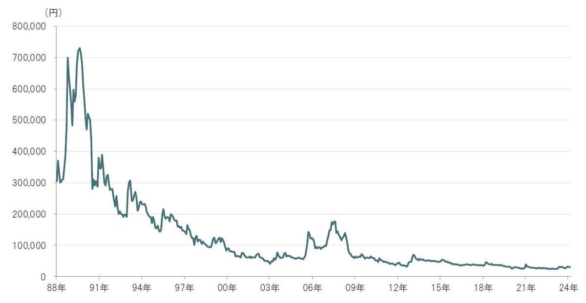 図表4:日本銀行の株価(月次、期間:1988年3月末~2024年4月末)