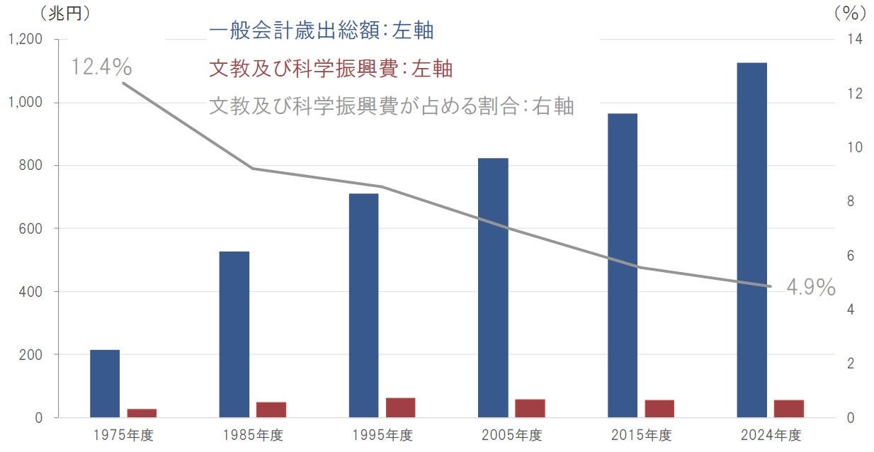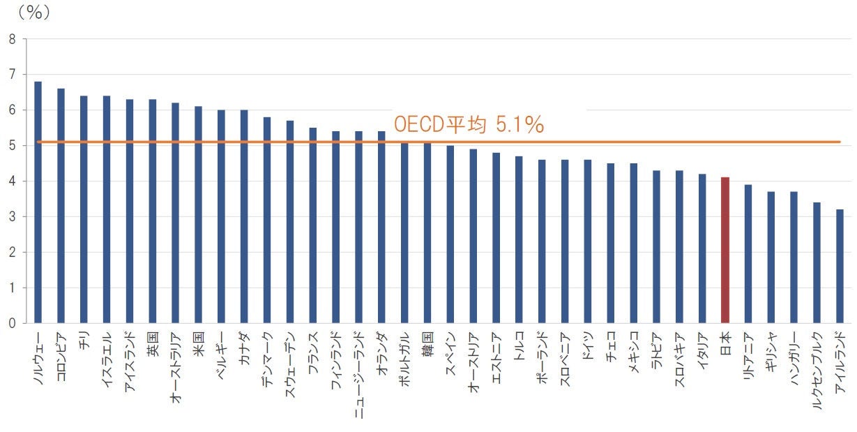 これまで日本の財政について、主に政府債務残高の増大について様々な問題点や課題をご説明してきました。本シリーズの最終号となる今回は、前述の政府債務以外で今後改善が期待される課題の1つとして、「教育への投資」についてご説明いたします。図表1は、国の一般会計歳出総額における文教及び科学振興費注の予算とその割合を表したものです。1975年から約50年間、一般会計歳出総額の増加に対し、未来への投資である文教及び科学振興費はほぼ横ばいの状態が続いており、当然ながら総額に占める割合は低下の一途をたどっています。では、他国と比較するとどうでしょうか。図表2は、OECD(経済協力開発機構)加盟国の国内総生産(GDP)に対する教育支出の割合を表したものです。OECDの平均5.1%に対して日本は4.1%と下回っております。これらのデータから、日本の財政が抱える課題の1つとして「教育への投資」に十分な予算を割くことができていない点があげられるのではないでしょうか。