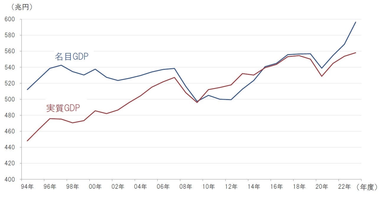 図表3:名目GDPと実質GDPの推移(1994年~2023年)