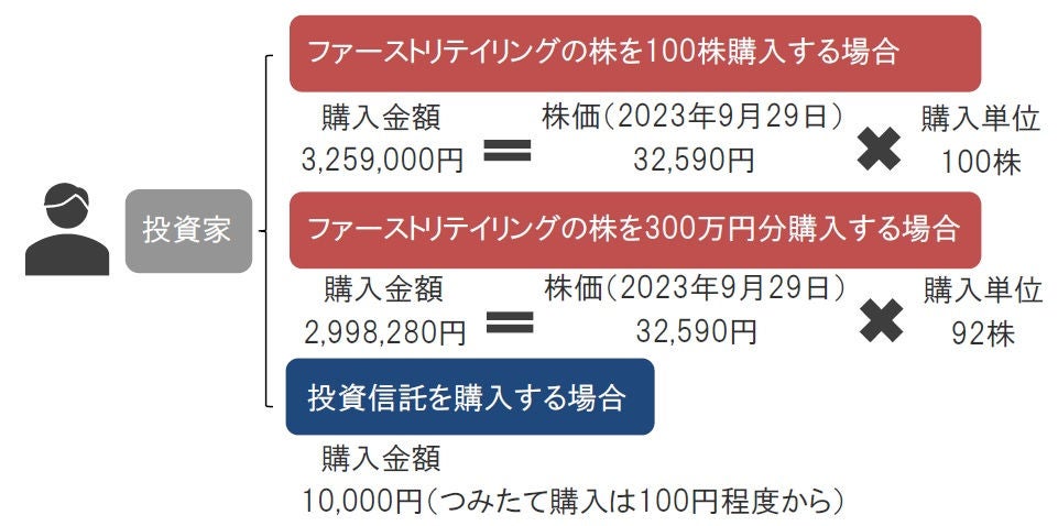 まずポイントの1つ目は、「少額投資」です。投資信託は1万円ほどから、つみたて投資の場合には100円程度から購入が可能なため、投資初心者の方でも多額の資金を必要とせず運用を始めることができる金融商品となっています。一般的に、国内の上場株式やETFを購入する場合、単元株(売買単位)制度が存在しますので、ある程度まとまった資金が必要となります。たとえば、ユニクロで有名なファーストリテイリングの株式を購入するケースを想定してみます。現在、株価は3万円を超えていますが(2023年9月末時点)、売買単位が100株のため、実際の購入には300万円以上の資金が必要となります。また、これは金額指定で投資することが難しいことを意味します。300万円分のファーストリテイリングの株式を購入したいと考えても、株価が32,590円であれば92株しか購入できず、投資金額ぴったりに購入することは難しいです注。一方、投資信託であれば多くの場合、金額指定での購入が可能です(図表2)。
