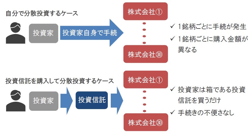次に、ポイント2つ目は「分散投資」についてです。投資信託は箱のようなイメージの金融商品であり、その箱の中に様々な資産を入れて運用することが可能です。また、多くの投資家の資金をまとめて運用をするため、取引コストを低減することができるなど、効率よく分散投資をすることができます。例えば、株式30銘柄に個別で投資するケースと、投資信託が一括でそれらの株式に投資するケースを考えます(図表3)。前者は株式購入の手続に時間を要するだけでなく、銘柄ごとの購入金額や購入手数料も異なり、また、30銘柄の購入総額も投資信託の購入に比べ大きくなる可能性があります。一方、後者は投資信託が自分自身に代わって株式の購入をしてくれるので、個別で購入する手続き面の負担や、銘柄毎に購入金額が異なるという煩わしさから解放されます。NISAは投資可能な金額が限られていますので、その枠を最大限活用し、投資効率を高める観点でも、投資信託の活用が望ましいと考えられます。