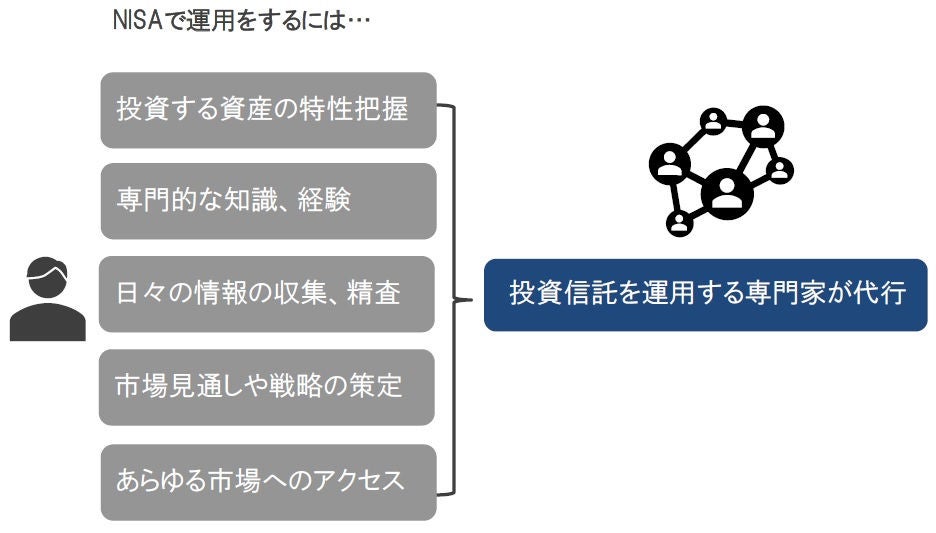 最後にポイント3つ目の「専門家にお任せ」についてご説明いたします。ポイントの2つ目でご説明したように、投資家は投資信託を買うだけで、様々な手間と時間を節約することができますが、さらに、どの国に、どの業種に、どの程度の数を、どのように組合せて投資するかなどのすべてを専門家である運用会社に任せることができる点も大きな魅力です。一般的に、元本保証のない投資を行う際には、投資する資産のリスクやリターンの特性を正確に把握し、日々変わりゆくマーケットに対応するための情報収集を緻密に行い、適切な資産の組合せを考える必要があります(図表4)。これらを個人投資家がすべて行うことは非常に難しいといえます。また、新興国市場のように、個人投資家ではアクセスが難しい市場への投資も専門家に任せれば投資が可能であり、投資の選択肢を広げ、新たなリターンの源泉を得ることができるといえます。2024年1月からスタートする新NISAは非課税期間が無期限となることから、多くの方にとって長期目線の投資が重要になると考えますが、そのためには投資資産の状況を適切にモニタリングしてくことが欠かせません。儲かっているか、損しているかの単純な損益のみならず、専門家に委ねることで得られる便益も理解しておく必要があるといえるでしょう。