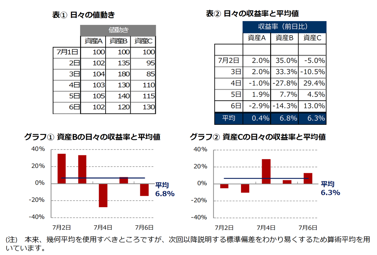 Bは100が120に、Cは100が130になっていますので、スタート時点からゴール時点までずっと投資していたなら、BよりもCの⽅が⾼いリターンを実現したことになります。ところが、⽇々の値動きまで⾒てみると様子が違ってきます。この期間中のどこか1⽇だけ選んで投資する場合、BとCのどちらが⾼いリターンを得られる可能性が⾼いでしょうか。また、Bはこの期間中に180まで上昇し最終的に120となっているのに対し、Cは⼀度85まで下落した後、130へと上昇しています。どの期間投資するかでリターンに差が出そうですね。例えば、この2資産の値動きの⽇々の収益率を計算すると、下表②のようになります。また、⽇々の収益率の平均値はBが6.8%、Cが6.3%と、Bの⽅がやや⾼いことがわかります。つまり、この期間中どこか1⽇を選んで投資していた場合、そのリターンを均すとBの⽅が⾼いことになります。