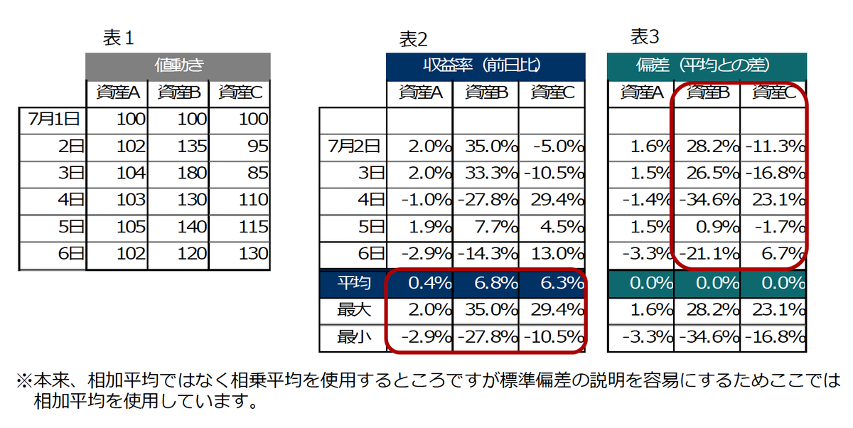 表3は資産A、B、Cの偏差の計算結果を表⽰しています。「偏差」は各数値が平均値からどのくらい離れているかを表すもので、各数値と平均値との差をとったシンプルな数字です。この「偏差」を⾒てみると、平均から±10%以内の偏差はBには1つしかなく、Cには2つあります。この「偏差」を⽐べるだけでもBとCの違いが分かりますが、この偏差に⼀⼿間加えると、もっと便利な数字になります。それが「標準偏差」です。
