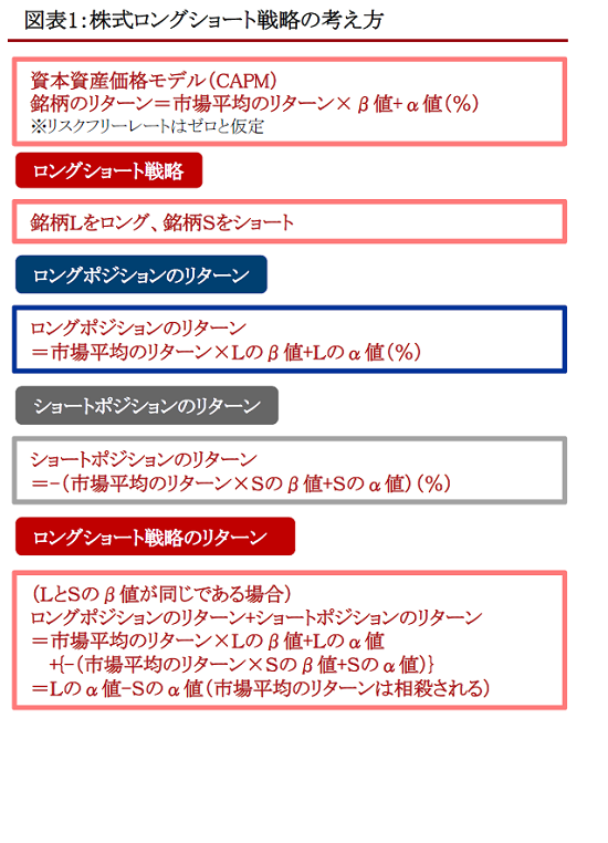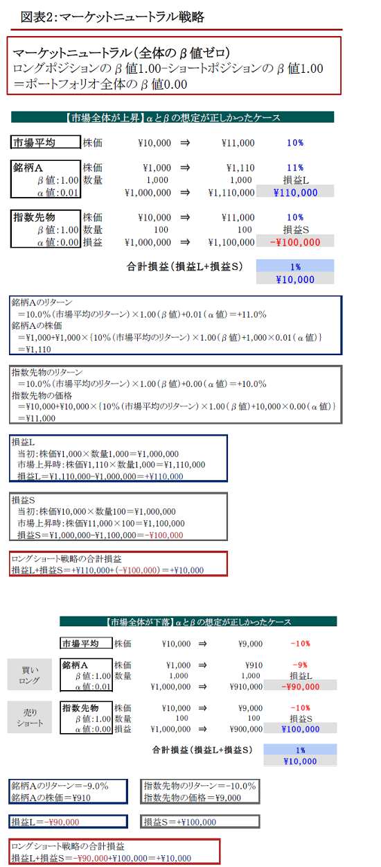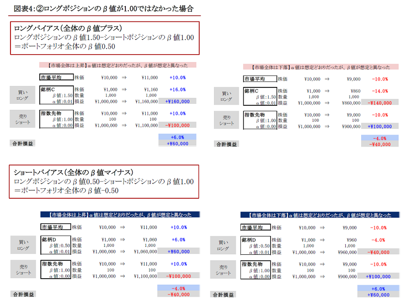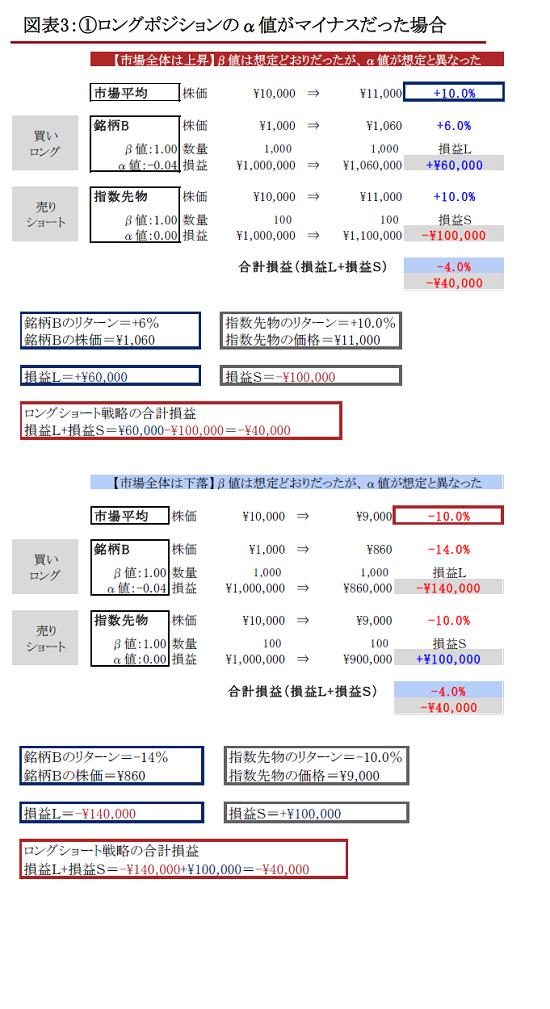 この戦略が正しく機能するためには、ロングポジションの銘柄選択が正しい、つまりロングポジションのα値とβ値が想定通りでなければなりません。もし銘柄選択が正しくなかった場合、期待したリターンは得られないということになります。ロングポジションの銘柄選択が誤っていたケースとして、①α値がマイナスだった、②β値が1.00ではなかった、の2つが考えられます。それぞれのケースにおいて、どのような結果になるか確認してみましょう。