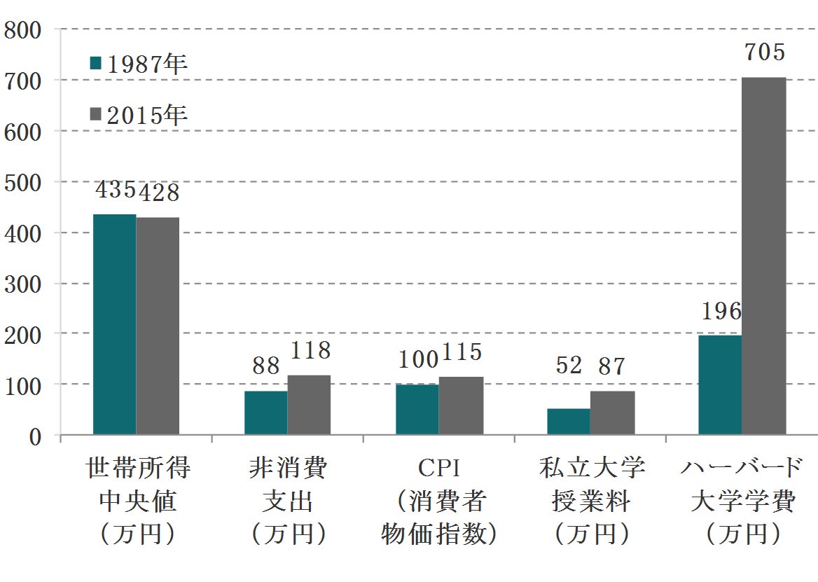続いて、1987年と2015年を比較してみましょう(図表2)。世帯 所得は435万円から428万円に減少し、非消費支出は88万 円から118万円に増加、この間、日本の消費者物価指数全 体は15%の伸びとなりました。日本の物価全体で見ると、 1987年の水準を100とすると115まで上がったということです。 非消費支出は34%増加しています。 一方で、たとえば私立大学の授業料は52万円から87万円に 67%上昇、円換算したハーバード大学の学費は196万円か ら705万円へと約3.6倍になりました。1987年当時800万円あ れば、ハーバード大学の学費4年分に相当しましたが、今は 800万円では1年分しか払えません。