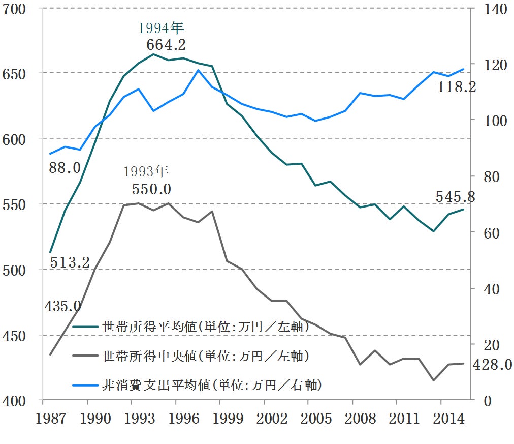 図表1:世帯所得と非消費支出(住民税・勤労所得税・社会 保険料)の推移(期間:1987年~2015年)