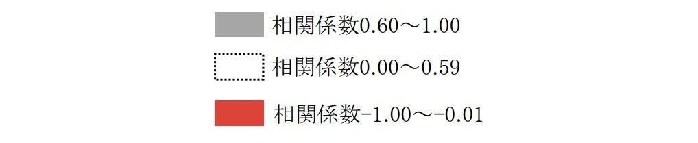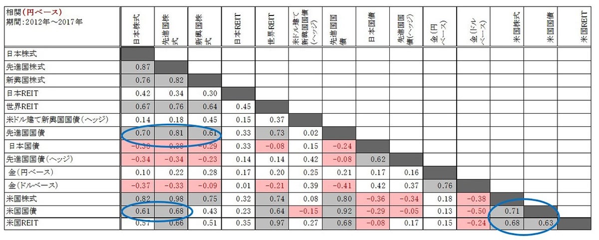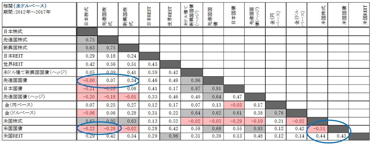 注:当資料では、相関係数が0.6以上の資産の組み合わせを十分な 分散投資効果が期待しにくいものとしてグレーに、一定の分散投資効 果が期待できる0以上0.6未満の組み合わせを白に、より大きな分散投 資効果を期待できる0未満の組み合わせを赤に、それぞれセルを色 分けして表示しています。