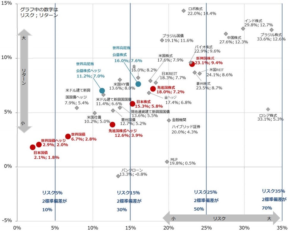 ※米国REIT:MSCI米国リート指数、日本REIT:TOPIX-Jリート指数、新興国株式:MSCIエマージング・マーケット指数、先進国株式:MSCIワールド指数、先進国株式(ヘッジ):MSCIワールド(ヘッジ)指数、 日本株式/米国株式/豪州株式/中国株式/インド株式/ブラジル株式/ロシア株式:MSCI各国指数、日本国債:FTSE日本国債指数、世界国債:FTSE世界国債指数、世界国債(ヘッジ):FTSE世 界国債(ヘッジ)指数、米国社債:BofAメリルリンチ米国社債指数、米国HY債:BofAメリルリンチ米国ハイイールド指数、米ドル建て新興国国債:JPモルガンEMBIグローバル・ディバーシファイド指数、米ド ル建て新興国国債(ヘッジ):JPモルガンEMBIグローバル・ディバーシファイド(ヘッジ)指数、現地通貨建て新興国国債:JPモルガンGBI-EMグローバル・ディバーシファイド指数、豪州国債:FTSE豪州国 債指数、バンクローン:S&P/LSTAレバレッジド・ローン指数、ブラジル国債:JPモルガンGBI-EMブラジル・ブロード指数、バイオ株式:ナスダック・バイオ株指数、MLP:AlerianMLP指数、ロボ株式:ROBO グローバル・ロボティクス&オートメーション指数、世界高配当公益株式:MSCI世界高配当公益株価指数、世界高配当公益株式(ヘッジ):MSCI世界高配当公益株価(ヘッジ)指数、金融機関ハイブリッド 証券:ウェルズ・ファーゴ金融機関ハイブリッド証券指数。すべて円換算。期間中の各月のリターンを年率換算して集計し、平均をリターン、標準偏差をリスクとして表示。
