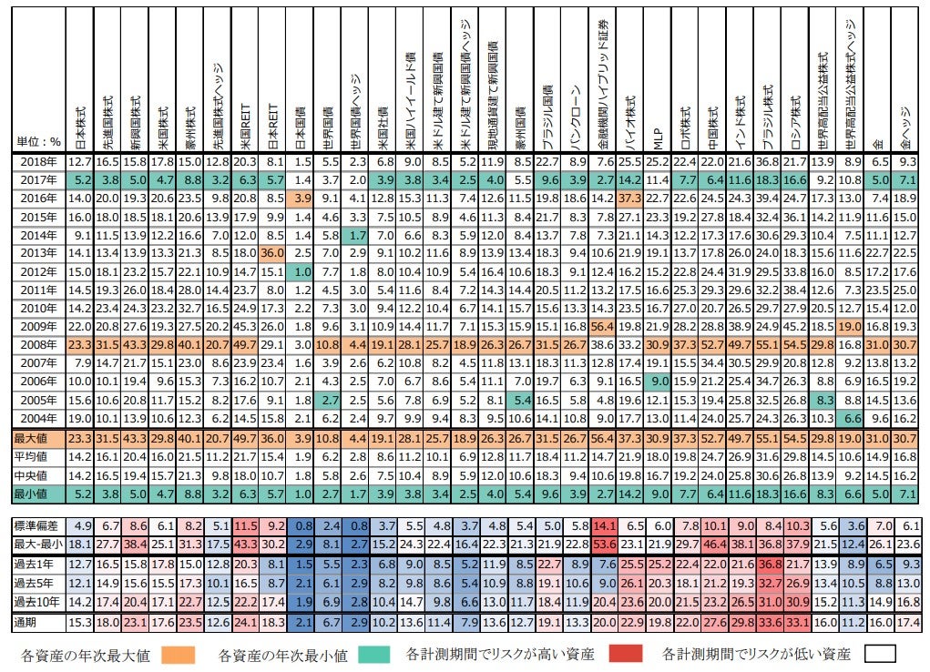 図表2は各資産の標準偏差(年率)の年次推移を2004年から見たものです。リーマンショックが起こった2008年は、ほと んどの資産の価格変動幅が大きく、一方、2017年はほとんどの資産の価格変動幅が小さかったことがわかります。した がって、過去1年間など短期間でのリスク特性を判断すると、リスクを見誤りかねません。その資産が持つリスク要因が 顕在化したときに、とんでもないリスク量をとっていたことに初めて気付く、というようなことも起こり得ます。