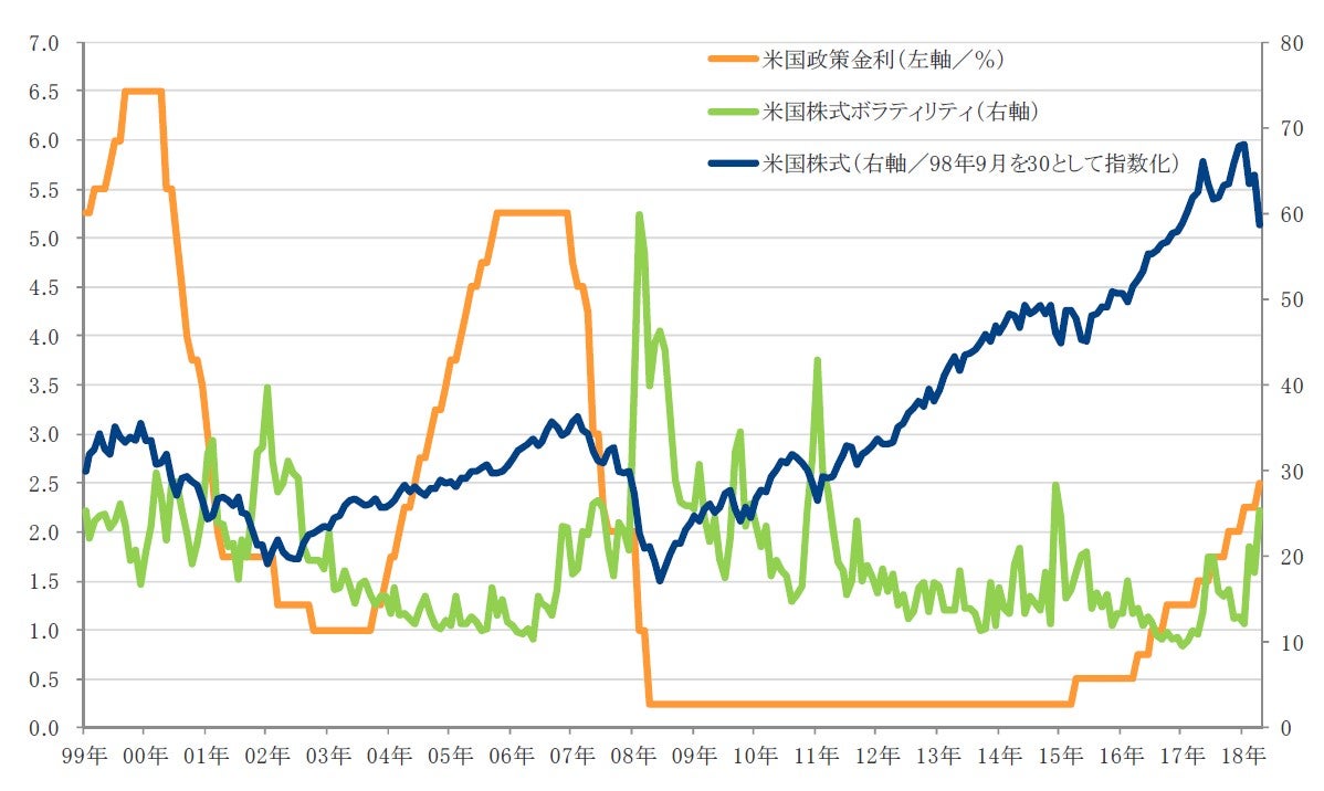 図表1:米国の政策金利と米国株式株価、ボラティリティの推移