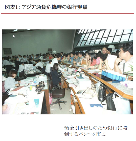1990年代のタイは年平均9%程度の高い経済成長率を記録しましたが、1995年の「強いドル」政策のあと1996年には貿易赤字に陥りました。この状況下でヘッジファンドがタイ・バーツに売りを浴びせました。タイ政府は外貨準備である米ドルを売ってタイバーツを買い支えるとともに、ヘッジファンドがタイバーツを調達できないように、バーツのオーバーナイト借入レートを3,000%にまで高めて対抗しました。