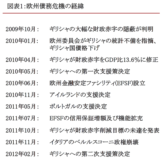 欧州各国の政府の財政は、リーマンショック後時に巨大金融機関を救済したことにより毀損し、財政状況が大幅悪化しました。そういった状況下で2009年10月、ギリシャの政権交代時に、旧政権が行ってきた大幅な財政赤字の隠蔽が明らかになりました。従来GDP比で4%程度とされていた財政赤字が、実際は12.7%に達していたこと(その後13.6%であることが判明)が明らかになり、2010年1月に、欧州委員会がギリシャの統計不備を指摘したことが報道され、表面化しました。これに対して、ギリシャ政府は3ヵ年財政健全化計画を発表しましたが、あまりにも楽観的な経済成長が前提であったため、格付会社各社がギリシャ国債の格付けをA格相当からBB格相当まで下げ、ギリシャ国債価格は暴落しました。