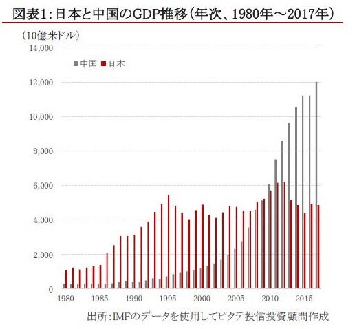 2010年、日本が世界第2位の経済大国の地位を中国に明 け渡すという、日本人にとってはショックな出来事が起こりま した。日本が1968年に当時の西ドイツを抜いて世界第2位 になって以来、42年目の出来事でした。 2010年8月に内閣府が発表した、第2四半期の日本の名目 GDP(米ドル換算)は1兆2,883億米ドルで、この額は同時期 の中国の1兆3,369億米ドルと比べて486億米ドル少なく、日 本のGDP額が中国のGDP額に抜かれた格好となりました。 中国の経済成長率は高く、低成長率の日本が再び逆転す る可能性は低く、この時を基点として両国の経済規模の格 差がどんどん拡大していきました。年次ベースで見ると、 2010年のGDPは、中国が6兆660億米ドル、日本が5兆7,000 億米ドルという結果になりました(図表1)。
