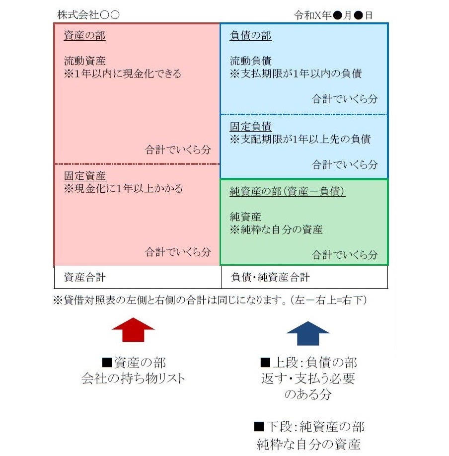 まず、貸借対照表にはいつ時点の内容かを示す「日付」が入っています。そして、貸借対照表の左側には、どんな資産をいくら分持っているのかを表す会社の持ち物リスト」があります。この持ち物リストを「資産の部」といいます。具体的には、現金:○○円、在庫:○○円、土地:○○円、建物:○○円というように資産の種類といくらの価値があるのかが書いてあります。