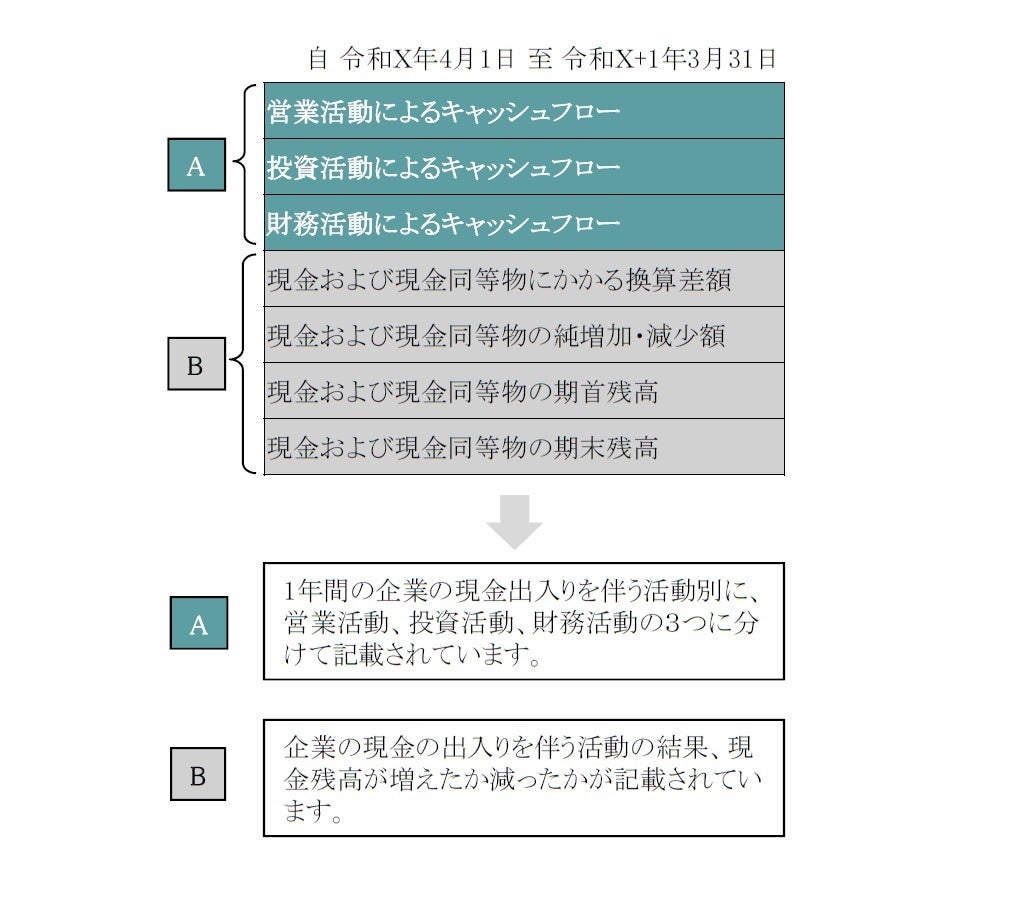 キャッシュフロー計算書(C/F)は一定期間の現金の出入りを報告するものです。「何にキャッシュを使い、そのキャッシュはどこで調達してきたのか」、「資金繰りは大丈夫か」等を家計簿のように記録して表しています。また、いつからいつまでの期間の記録なのかを表す「期間」が入っています。キャッシュフロー計算書には、1年間の企業の現金の出入りを伴う活動が、それぞれ「営業活動」「投資活動」「財務活動」の3つに区分して記載されています(図表1)。