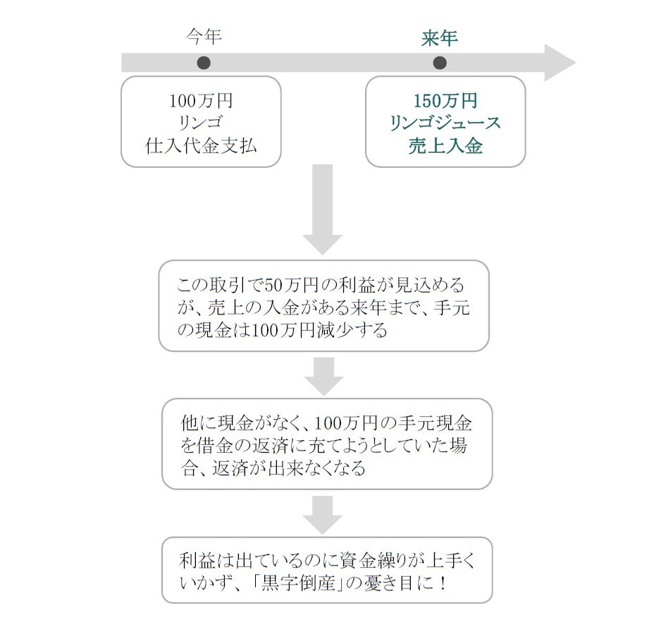 リンゴジュースの売上は150万円、費用であるリンゴの仕入れは100万円ですから50万円の利益です。ところが現金の出入りを考えると、リンゴの仕入れは現金払いなので、まず現金100万円が出て行き、売上の150万円は来年まで入ってこないので、手元の現金は100万円減ってしまいます。