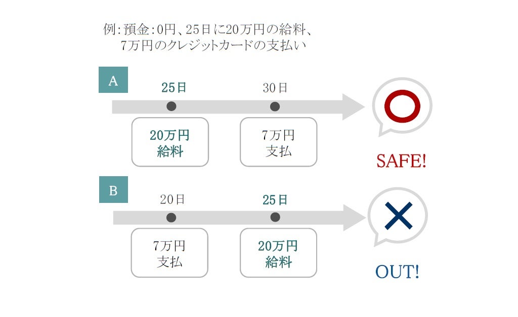 しかし、Bのようにクレジットカードの引き落とし日が給料日前の20日だった場合、20日時点では預金残高が0円で7万円の引き落としが出来ないため、決済に支障が生じることになります。