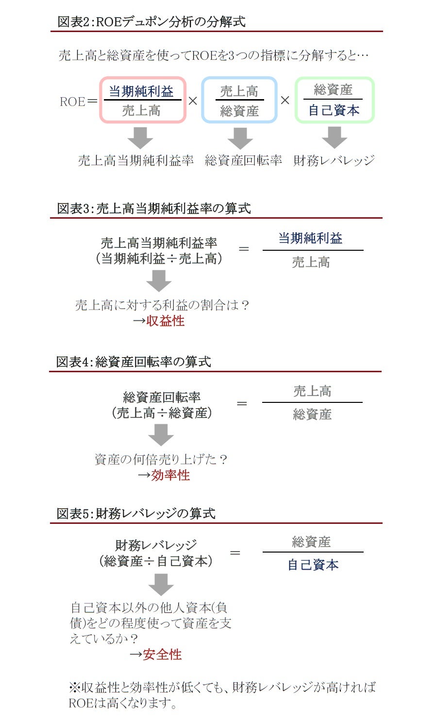 ROEは非常に良く出来た指標で、その数値自体で経営効率を表すことができるだけでなく、更に企業の収益性、効率性、安全性の3要素に分解して分析することが出来ます。これをROEデュポン分析といい、アメリカの大手化学企業デュポン社で開発されたことからこの名前がついています。売上高と総資産を使ってROEを3つの指標に分解すると、図表2の式で表すことができます。これら分解された3つの指標である「売上高当期純利益率」は収益性を、「総資産回転率」は効率性を、「財務レバレッジ」は安全性を、それぞれ分析出来ます(図表3~5)。
