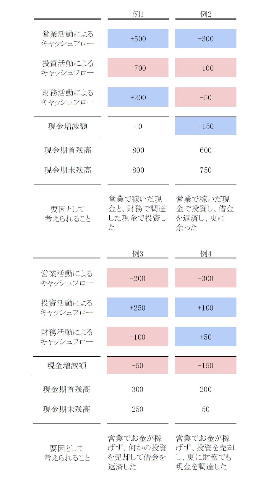 図表2にキャッシュフロー計算書分析の例を4つ掲載しましたので、参考にしてください。