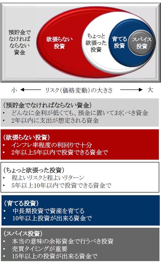 「預金を含めた資産の全体設計」を考える際には、図表1のイメージ図のように、金融資産全体を「預貯金でなければならない資金」、「欲張らない投資」、「ちょっと欲張った投資」、「育てる投資」、「スパイス投資」の5つに分割して検討することが重要です。
