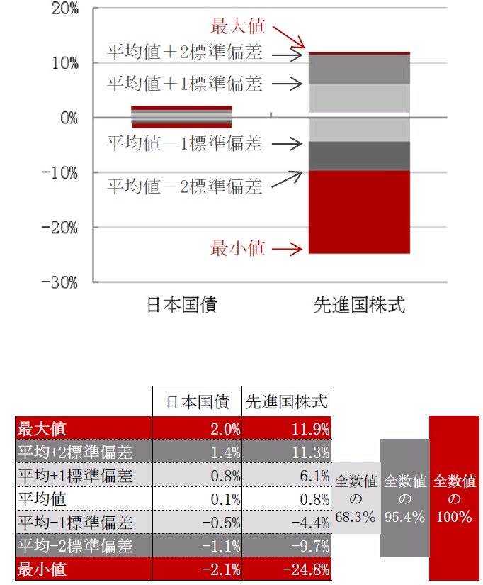 日本国債と先進国株式ではデータのバラつきの範囲(価格変動リスク)が大きく異なります。両者の標準偏差には大きな差があり、平均±1標準偏差が示す範囲でも、最大値・最小値の差が示す範囲でも大きな差があります。それぞれの収益率の散らばっている範囲を棒グラフで示していますが、それぞれの範囲内のどこかの収益率になるという場合、先進国株式の場合には良いときと悪いときの差が日本国債と比べて大きくなることが分かります。