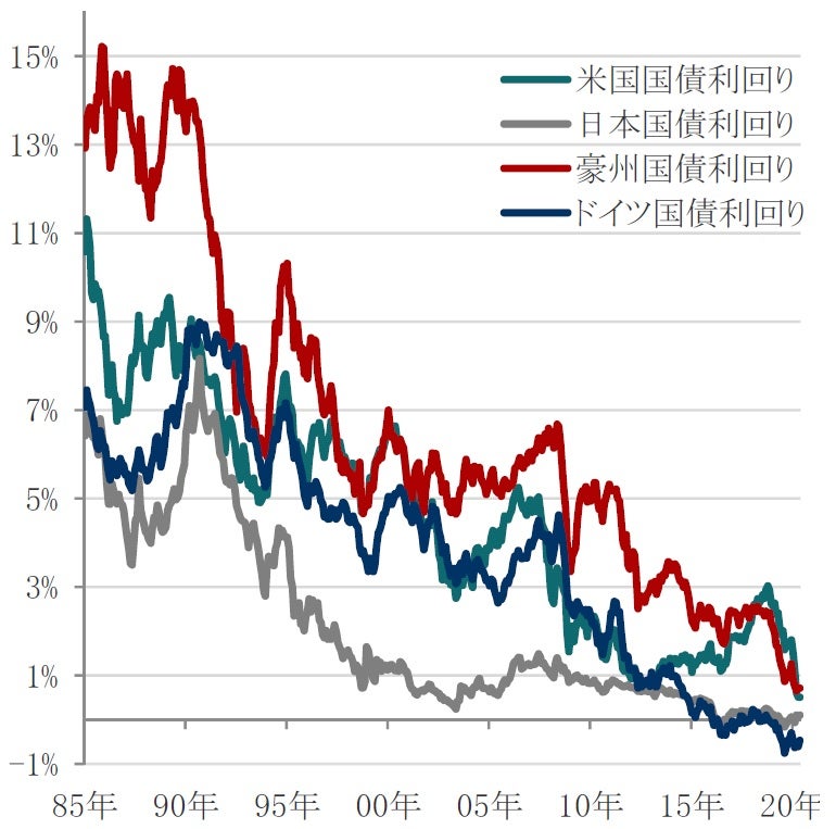 先進国の成長率とインフレ率の低下に伴い、先進国国債の利回りは過去30年に渡って大きく低下してきました。中でも日本国債やドイツ国債の利回りは大きく低下し、10年債利回りまでマイナスになる事態となりました(図表1)。