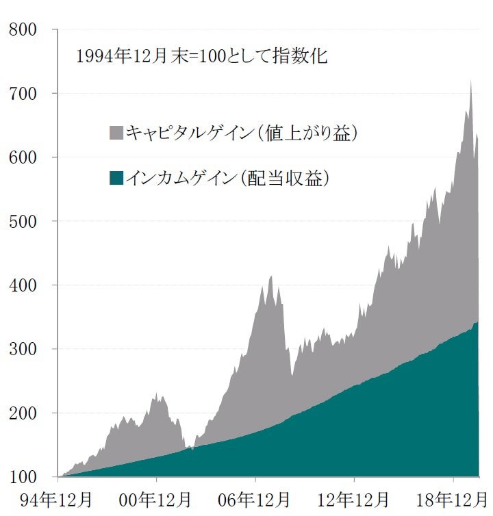 このグラフを見ると、キャピタルゲイン(値上がり益)は株価変動によって大きく変動していますが、インカムゲイン(配当収益)は長期投資することで着実に積み上がり、リターンを下支えしてくれていることが分かります。