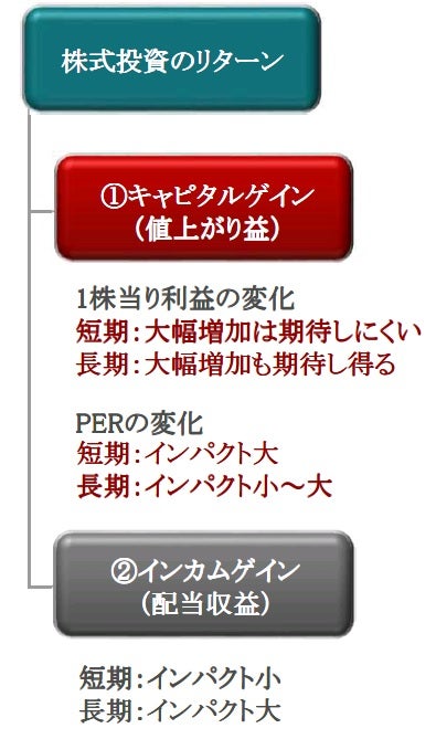 株式投資のリターンは大きく分けて①キャピタルゲイン(値上がり益)と②インカムゲイン(配当収益)とに分けられます(図表1)。