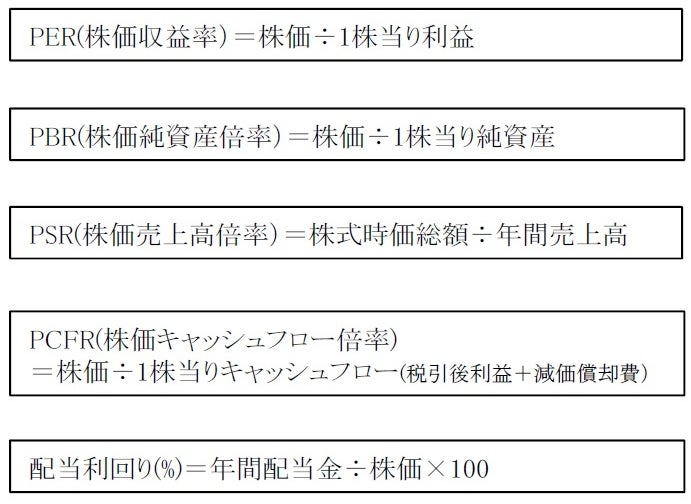 バリュエーション(投資価値評価)を確認する場合に参考となる指標としては、PER(株価収益率)の他に、PBR(株価純資産倍率)、PSR(株価売上高倍率)、PCFR(株価キャッシュフロー倍率)、配当利回り、などがあります。
