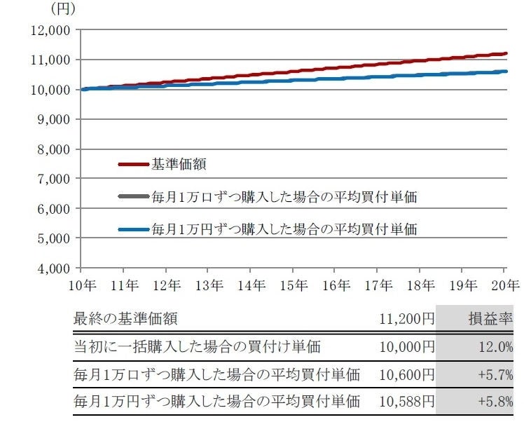 図表2:積立投資のイメージ2010年12月~2020年12月当初一括購入した場合と毎月積立した場合の違い