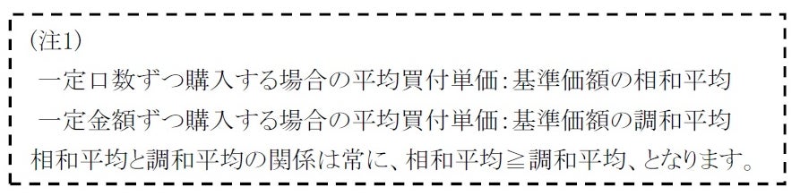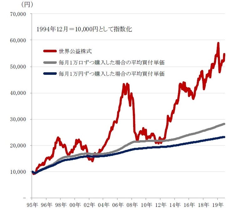時間分散のためにも積立投資が有効ということをお伝えしましたが、過去に、積立投資をしていた場合のシミュレーションを見てみましょう。1994年12月の世界公益株式を10,000円として指数化し、これを積立投資する投資信託の基準価額と見立てると、2020年11月末には54,719円となっています。もちろん、当初に一括投資をしていれば投資資金は大きく増えていたことになりますが、まとまった投資資金がない場合でも毎月少しずつ積立投資をしていくことで大きなリターンを得ることができました。積立投資をする場合、数学的性質(注1)により一定口数ずつ購入するよりも一定金額ずつ購入する方が平均買付単価が低くなります。まとまった投資資金が無くとも、自動的に時間分散できる積立投資は有効な投資手段であることが理解できます。