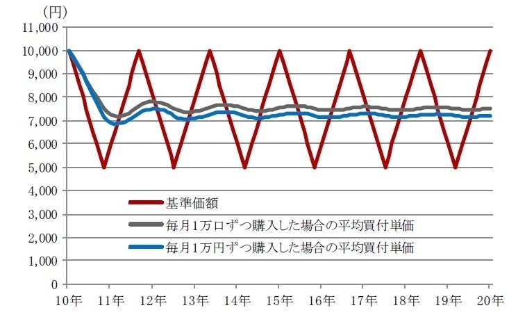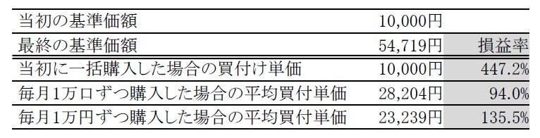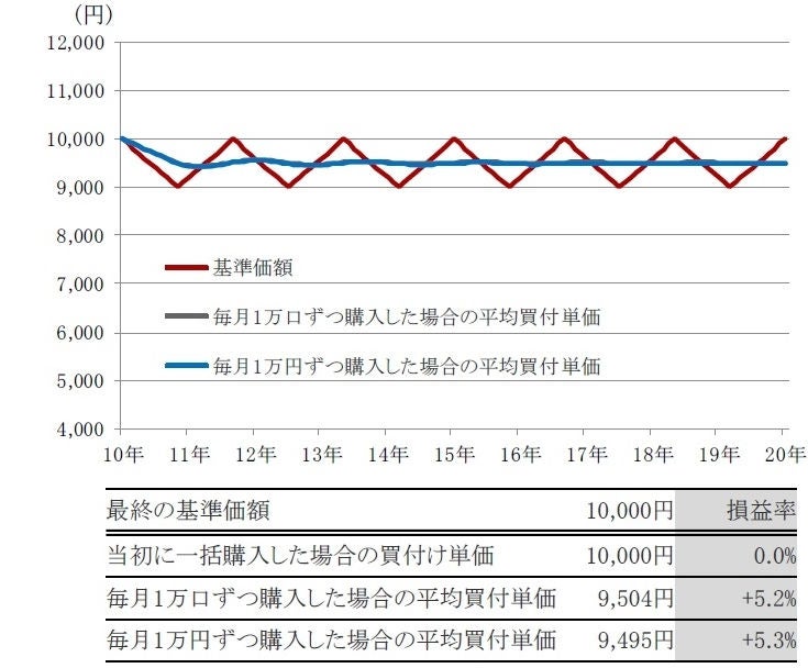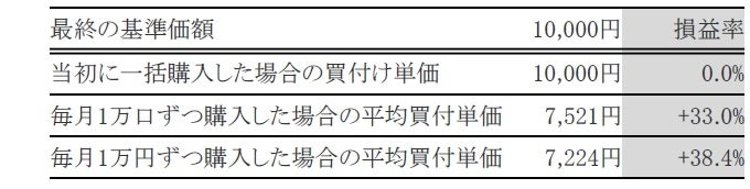 ケース①~③まで見てきましたが、変動幅の大きい資産ほど積立投資の効果は大きくなります。また、1万円ずつの購入は1万口ずつの購入に比べて平均買付単価が低くなっていることが確認できます。