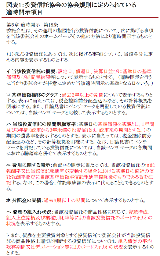 投資信託協会では、運用会社が月次レポートで行う「適時開示」の規則を定めています。こちらの協会規則では最低限、月次レポートに記載する項目が決められています(図表1)。