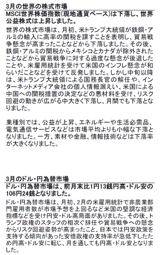 前述の基準価額変動の内訳で、1ヵ月間で株式要因が-4円、為替要因が-21円でした。ではこの1ヵ月間で何が起こったのでしょうか。それは市況の解説コメントを見れば分かります(図表2) 。