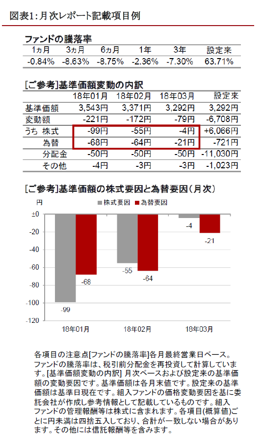 例えば、18年3月を見ると、1ヵ月で基準価額が79円の下落となっていますが、主な要因は為替と分配金だったことが分かります。また3ヵ月では騰落率-8.63%となっていますが、市況要因で申し上げると、株価と為替両方の要因でマイナスになっていることが分かります。