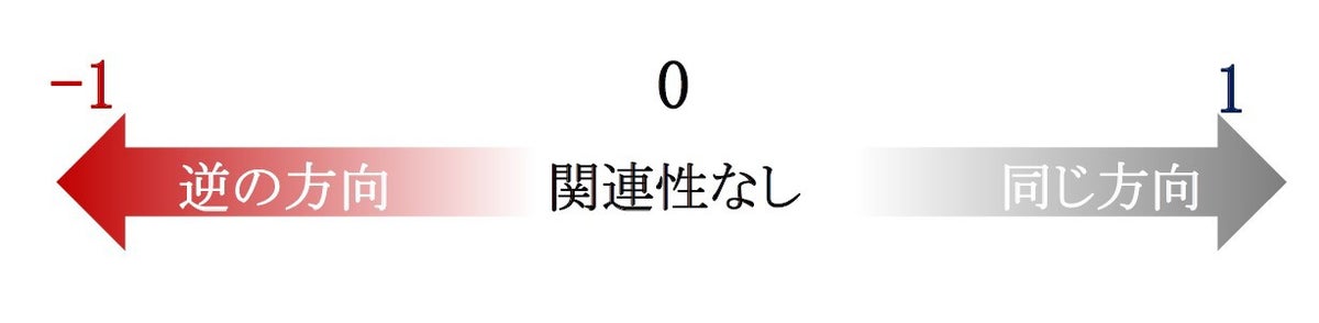 「相関係数」とは、2つのグループの数字が同じ方向に動く度合いを1~-1の間の数字で表すものです。相関係数が1に近いほど2つのグループの数字は同じ方向に、相関係数が0に近いほど関連性がなくなり、相関係数が-1に近づくほど逆方向に動くことを示します。