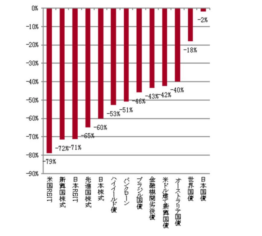 一方で、「最大下落率」は「最悪のケースでどのくらい値下がりしたのか」を教えてくれます。右の図表2は、リーマン・ショック時の各資産の最大下落率のグラフですが、日本株式は6割、日本REITは約7割、米国REITに至っては約8割弱、下落しました。このように、リーマン・ショック時に各資産が最大でどのくらい値下がりしたかを知っておくと、「最悪のケースでどれくらいの損失を覚悟しなければならないか」のひとつの目安になります。