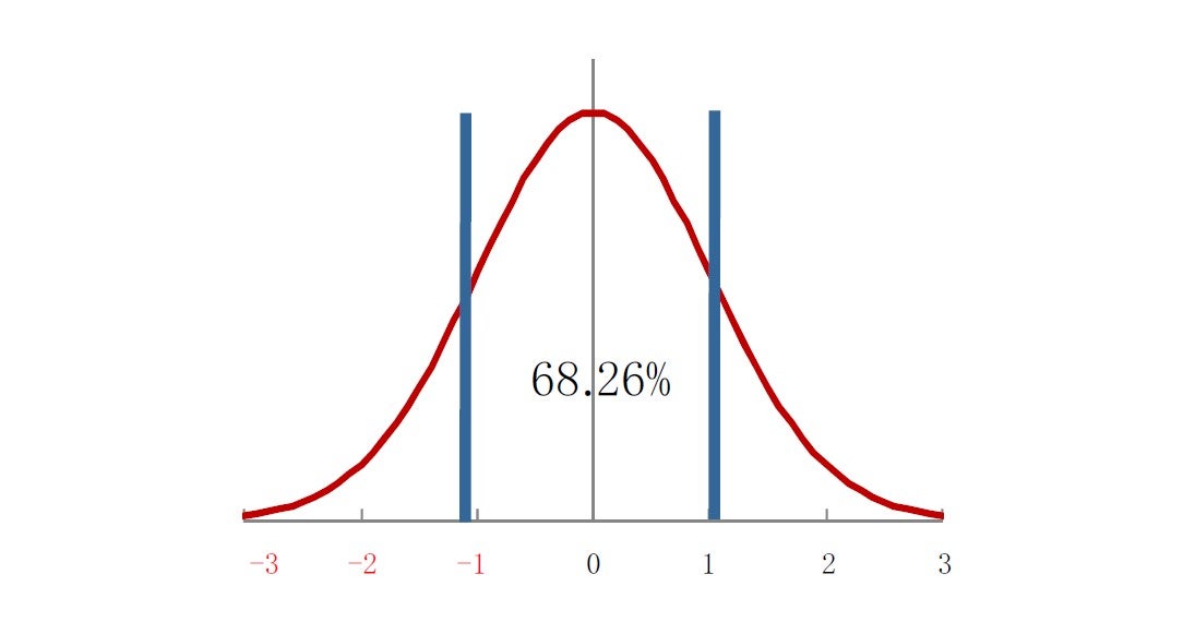 1標準偏差では68.26%のデータが「平均値±標準偏差」の範囲に収まります