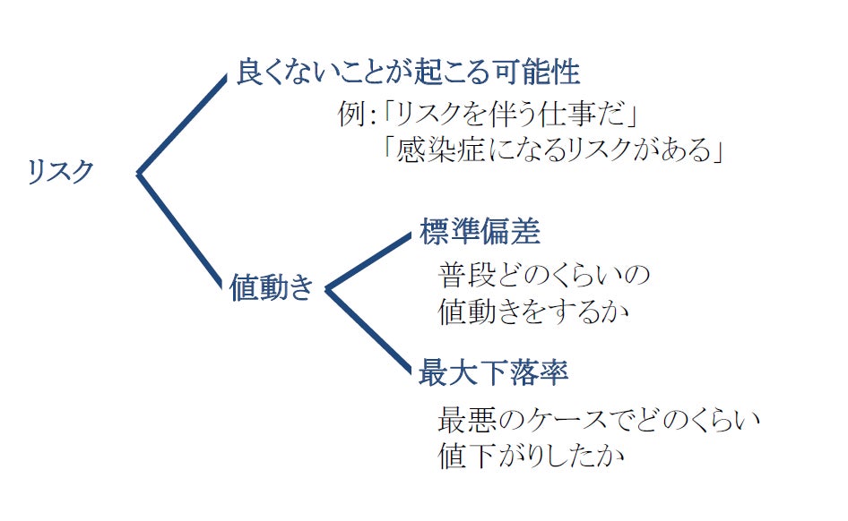 一般的に「リスク」というと、「良くないことが起こる可能性」の意味で使われることが多いですが、投資の世界ではその意味に加えて「値動き」を意味します(図表1)。
