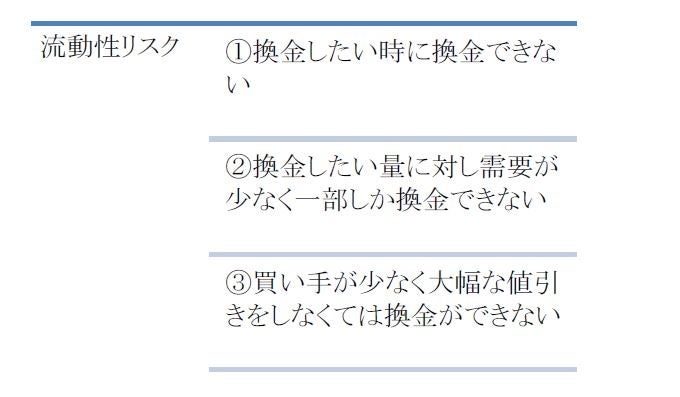 流動性リスクとは、市場規模や取引量が小さい場合や市場混乱時など買い手が少なくなった場合に、①換金したい時に換金できない、②換金したい量に対し需要が少なく一部しか換金できない、③買い手が少なく大幅な値引きをしなくては換金ができない、といったことが起こるリスクのことです。