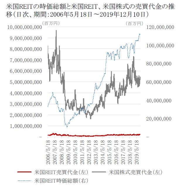 世界最大のREIT市場である米国REITの時価総額は、2008年以降に大きく増えて110兆円レベルになりました。一方で1日の売買代金は1,000〜3,000億円程度と、米国株式市場と比べて小さく、価格が大きく上下しやすくなってしまいます。